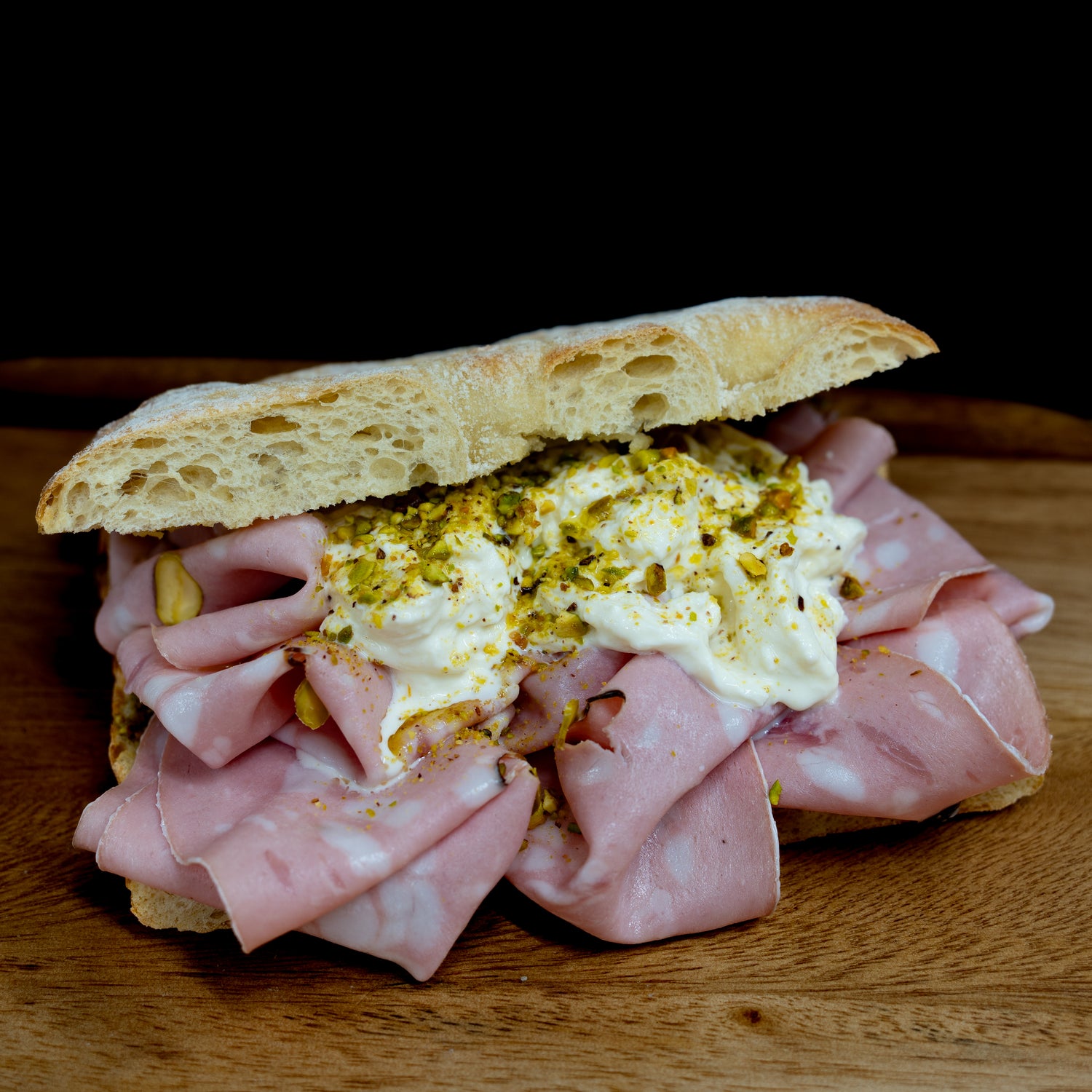 pistachio crema, mortadella, stracciatella, pistachio crumble
