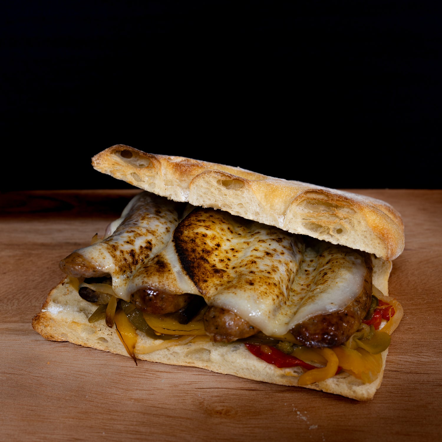 sausage, eggplant, peperonata, caramelized onions, caciocavallo