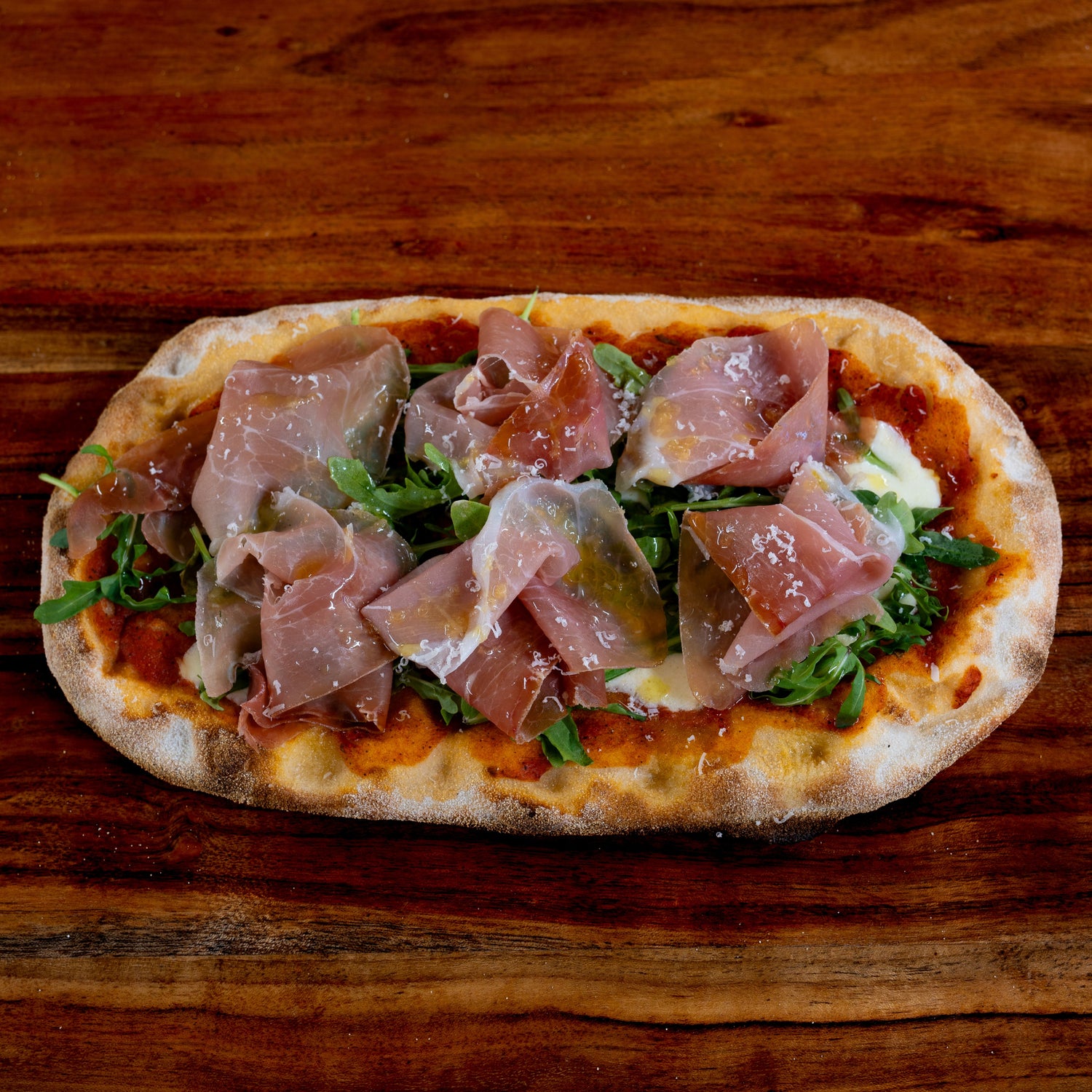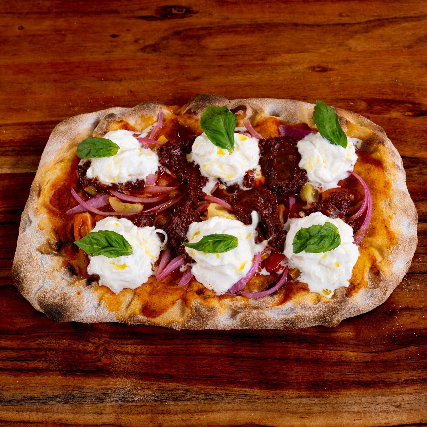 san marzano, stracciatella, cherry tomatoes, nduja, cured purple onions