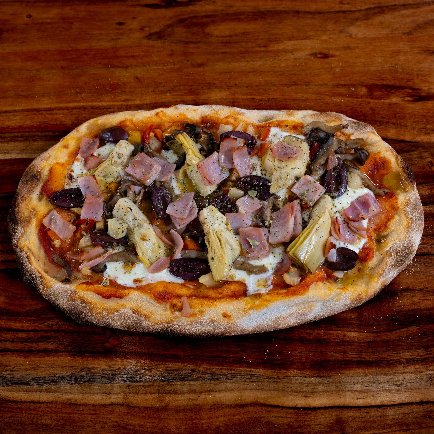 san marzano, fior di latte, prosciutto cotto, artichokes, black olives, porcini mushrooms, giardiniera