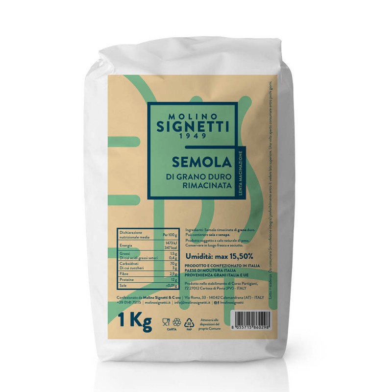 Produced in Italy by Molino Signetti, this semolina is obtained through careful double milling of selected durum wheat to achieve a fine, soft texture while preserving the grain’s natural character. The remilling process enhances workability and hydration, resulting in superior dough performance, flavor development, and consistent baking results.
